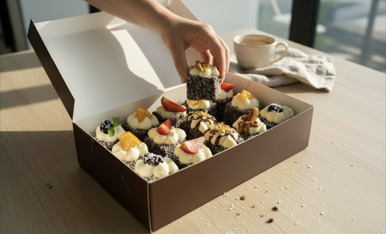 Box of 12 Cocktail Lamington Bites grazed with assorted fruits and assorted garnish