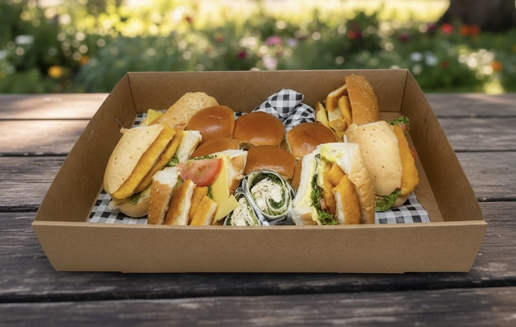 3 X Seeded Long Rolls, 6 Cocktail Rolls, 2 Wraps all filled with Various assorted chicken filling i.e. Roast Chicken and salad , Chicken tenders, chicken schnitzels